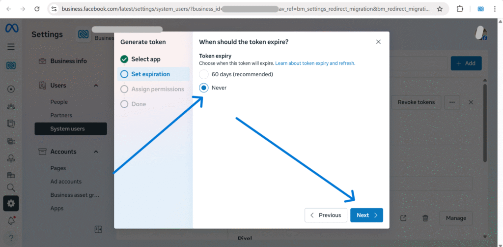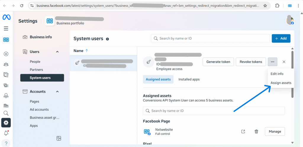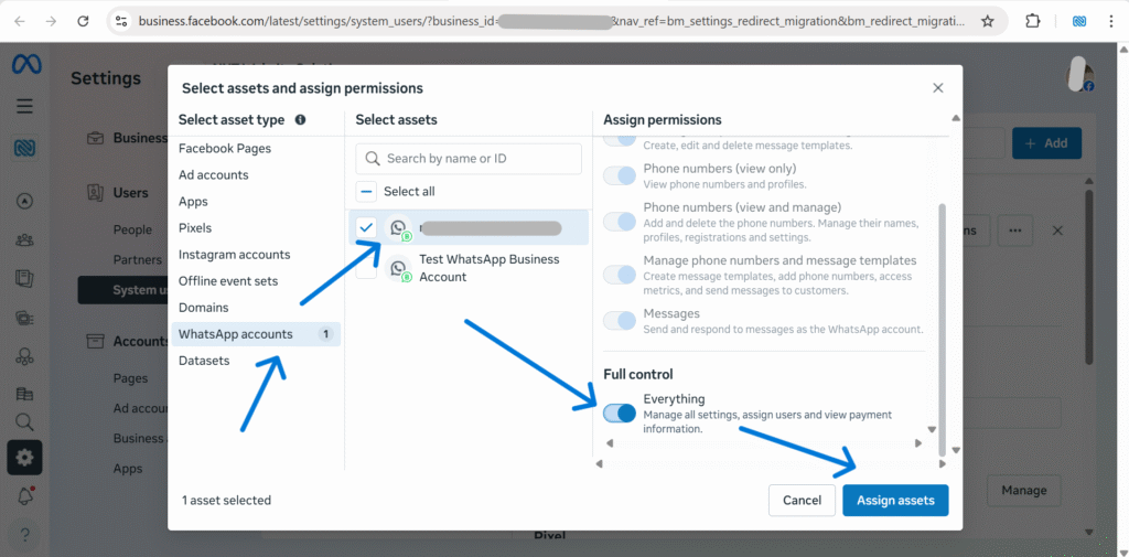 Select assest type WhatsApp accounts, then select the assest of your app, then give full control.