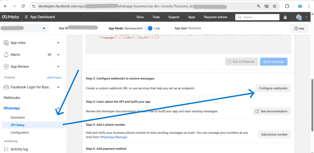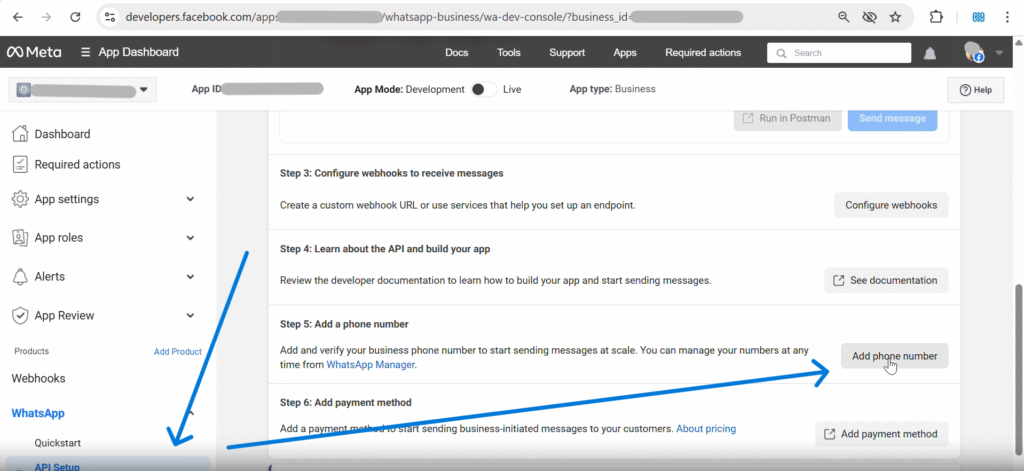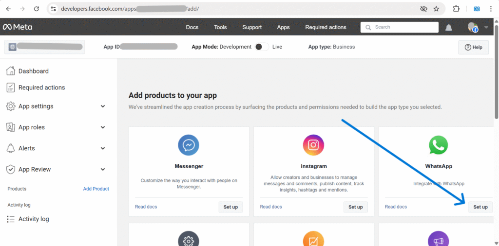 • Add Product to your app on the app dashboardScroll down to WhatsAppClick Set Up