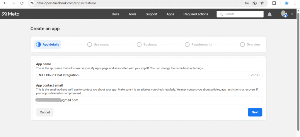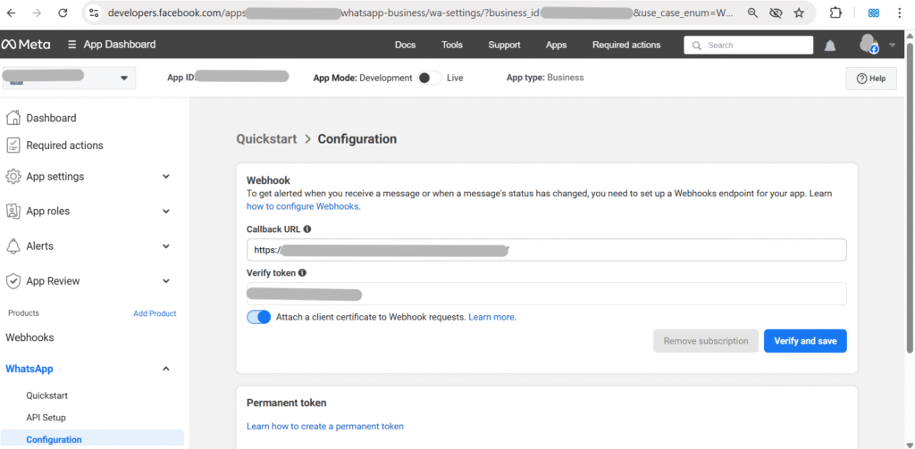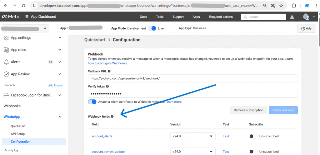 Copy Callback URL and Verify token from NXT Cloud Chat WordPress Plugin, paste it on Meta Developer Dashboard.