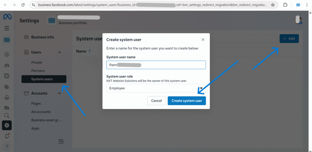 In Business portfolio, go to System users, click on Add button, then Create system user.